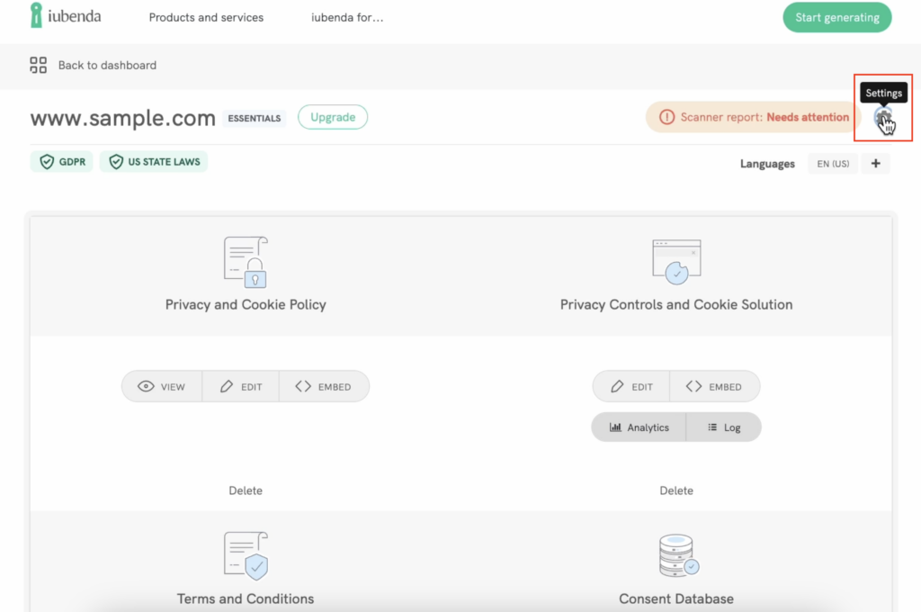 - Melden Sie sich in Ihrem iubenda-Konto an und gehen Sie zu Ihrem Dashboard;