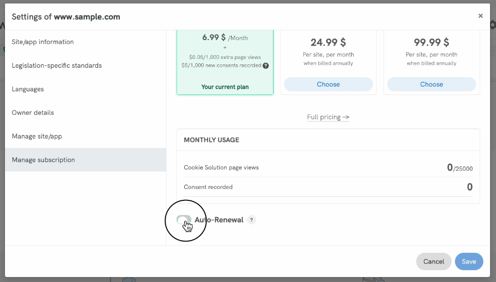 Ihr iubenda-Abonnement wird normalerweise monatlich/jährlich über unsere automatische Verlängerungsfunktion erneuert.