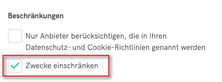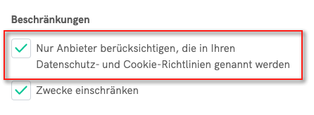 Es wird empfohlen, nur die TCF-Anbieter anzuzeigen, mit denen Sie tatsächlich zusammenarbeiten, und nicht die gesamte Liste der TCF-Anbieter. Anbieter müssen demnächst zusätzliche Informationen in der Global Vendor List (GVL) bereitstellen, damit die Publisher leichter entscheiden können, mit welchen Anbietern sie zusammenarbeiten wollen.