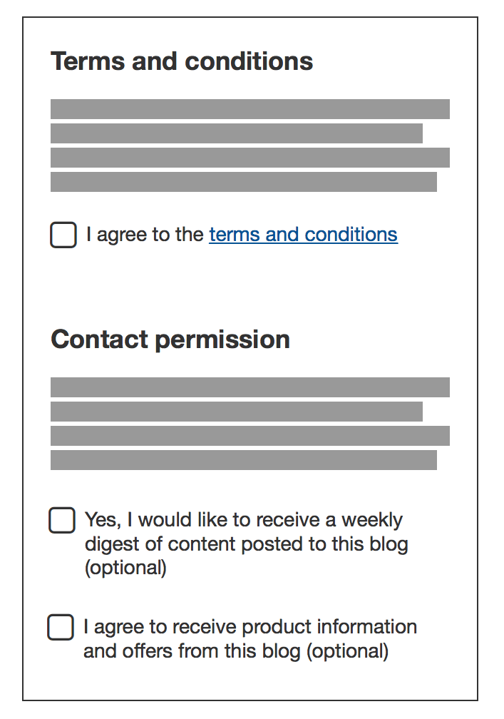 - Ask for different consents for each purpose: for example, you should have one box to agree to your Terms and Conditions and another one for marketing emails.