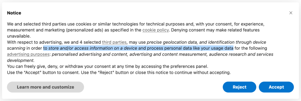 - Information about the fact that information is stored on and/or accessed from the user’s device (e.g. use of cookies, device identifiers, or other device data)