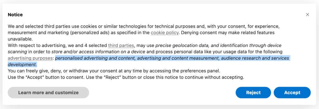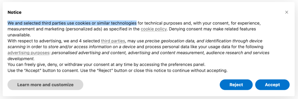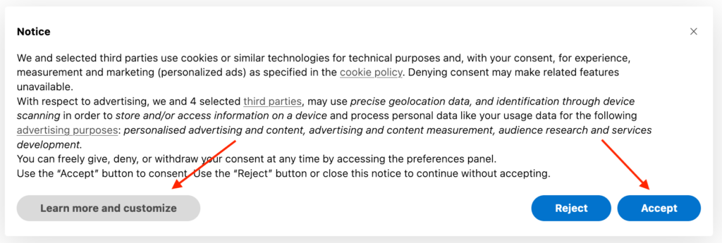 - A call to action for the user to express their consent (for example “Accept”, “Okay”, “Approve”, etc.) and one to customise their choices (for example “Advanced Settings”, “Customise Choices”, etc.)