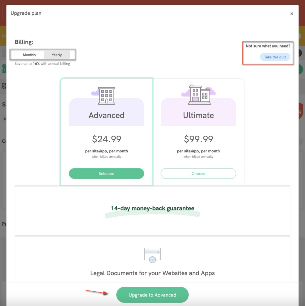 - Our upgrade window will display. Select the plan you want to switch to, if you want a monthly or yearly billing (💡 PRO TIP: save money on yearly plans!). If you’re not sure what plan you need, we have a quiz on the top right that can help.