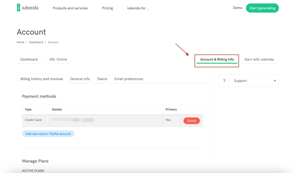 - Once in your iubenda dashboard, go to the “Account and Billing info” section in the top right corner, at this link: https://www.staging.iubenda.com/p/account;