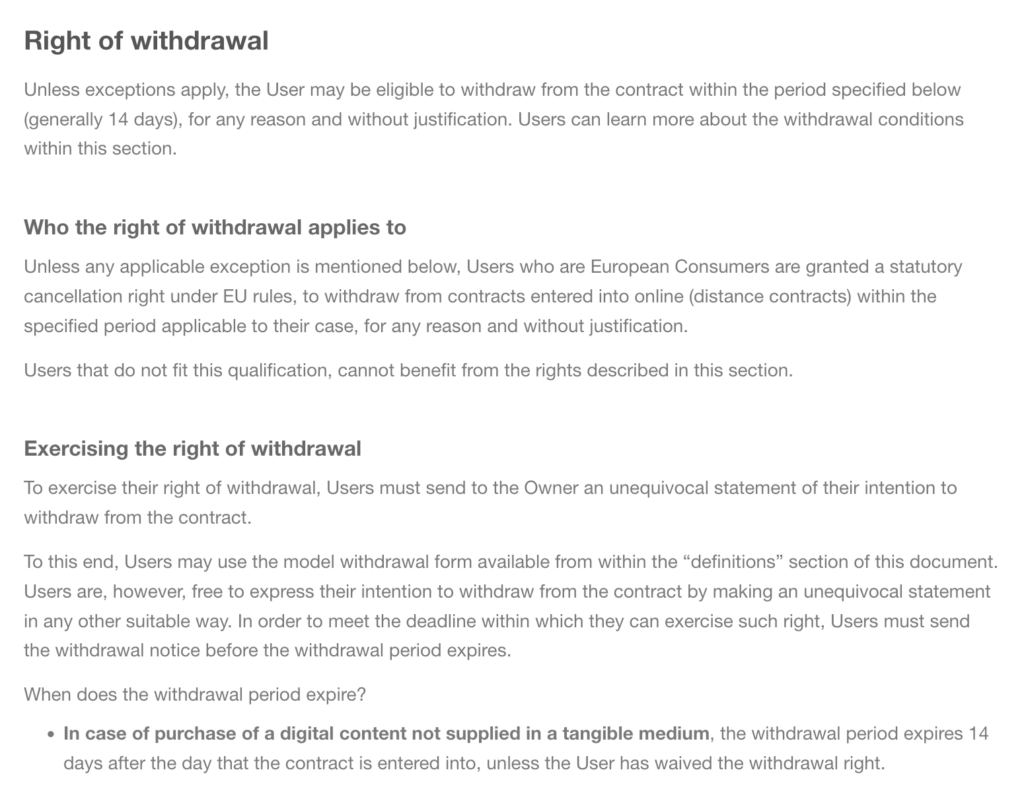 Since SaaS products are often delivered instantly and used immediately, some companies may apply exceptions to the right of withdrawal. Some SaaS companies might also have rules about trial periods, cancellations, and things like setup fees or custom integrations.