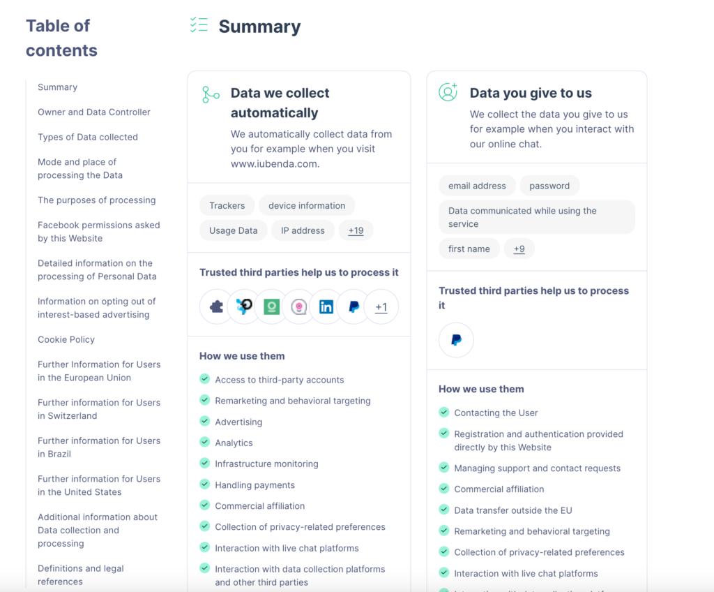 Finally, the one below is our privacy policy, created with iubenda’s Privacy and Cookie Policy Generator. We’ve redesigned our legal documents to make them more intuitive and easier to understand. As you can see below, we’ve added a Summary section at the top that contains the most important information, without having users scroll through a wall of text.