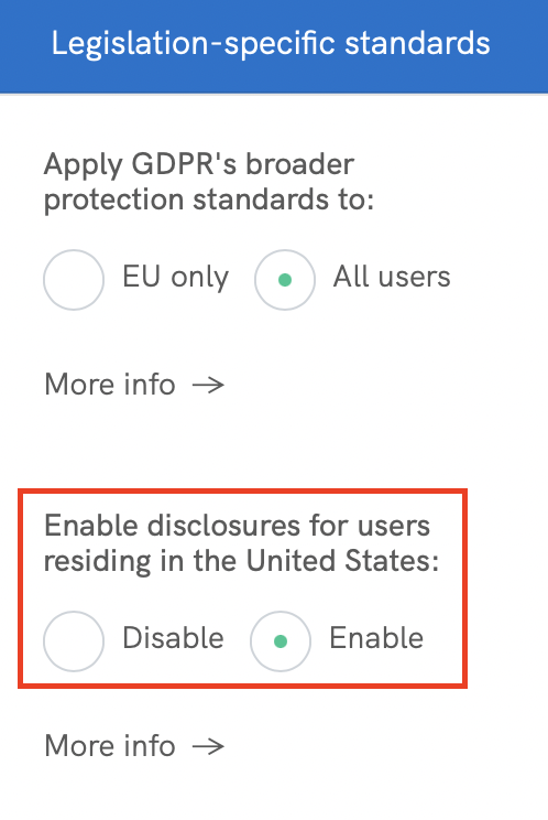 To enable the new US-specific clauses, simply click “Enable disclosures for Users Residing in the United States” from within the Privacy and Cookie Policy Generator. This will allow you to meet the strictest of US standards.