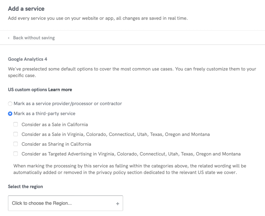 When enabling specific options related to state laws, the generator should indicate which services or activities may be considered a sale under the state’s definition. This helps ensure transparency and compliance with the respective state’s privacy regulations.