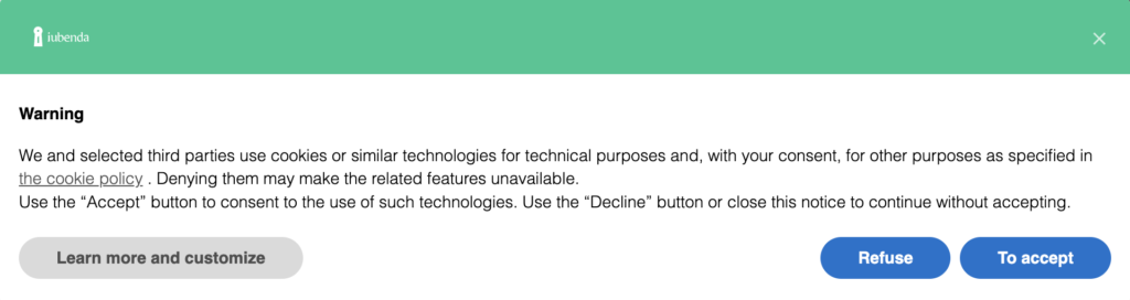 The Accept button allows your users to give consent to cookies by clicking on the explicit accept and – with the exception of Italy – it’s required to users who operate in the EU.
