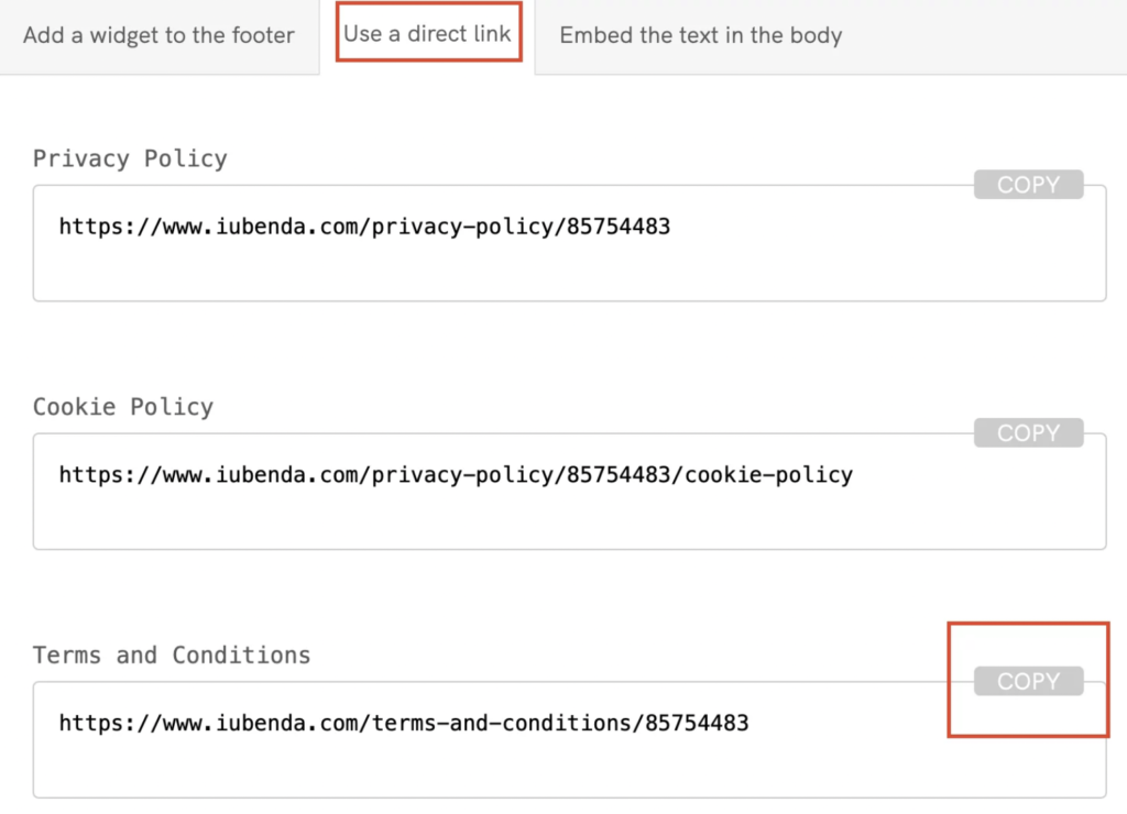 In the embed area of your iubenda dashboard, click on the Embed the text in the body tab and click on Copy under Terms and Conditions