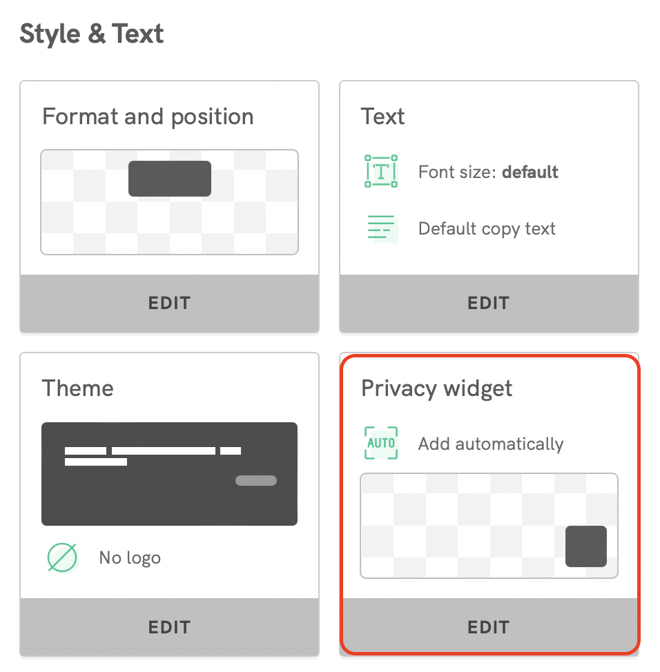 Within Privacy Widget options (under Style & Text configurations) you can customize the position, format, and colors of your widget or choose to add a link in the footer to your page to access privacy and tracking preferences.
