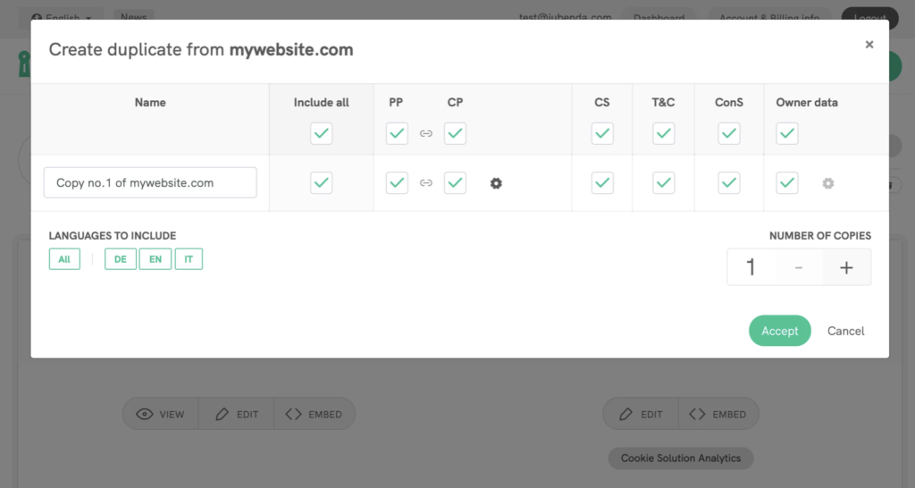 - go on your site/app page (Dashboard > [your website]) and click on the Duplicate button (next to the trash icon).