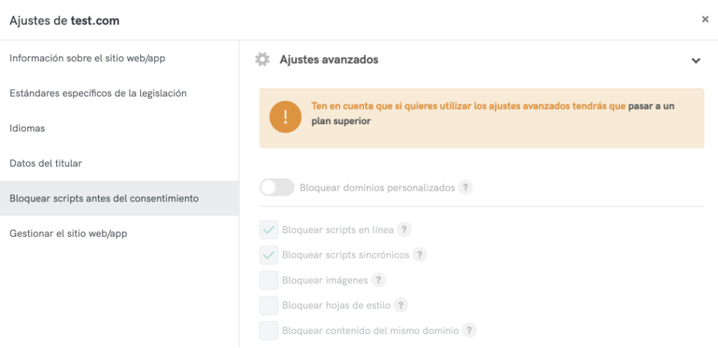 Bloquear scripts antes del consentimiento”, encontrarás la opción de configuración para el Bloqueo automático: