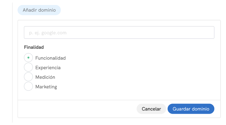 En los casos en que haya cookies que no se bloqueen automáticamente, tienes la opción de bloquear dominios personalizados añadiéndolos directamente o eligiendo excluir del bloqueo a determinados dominios.