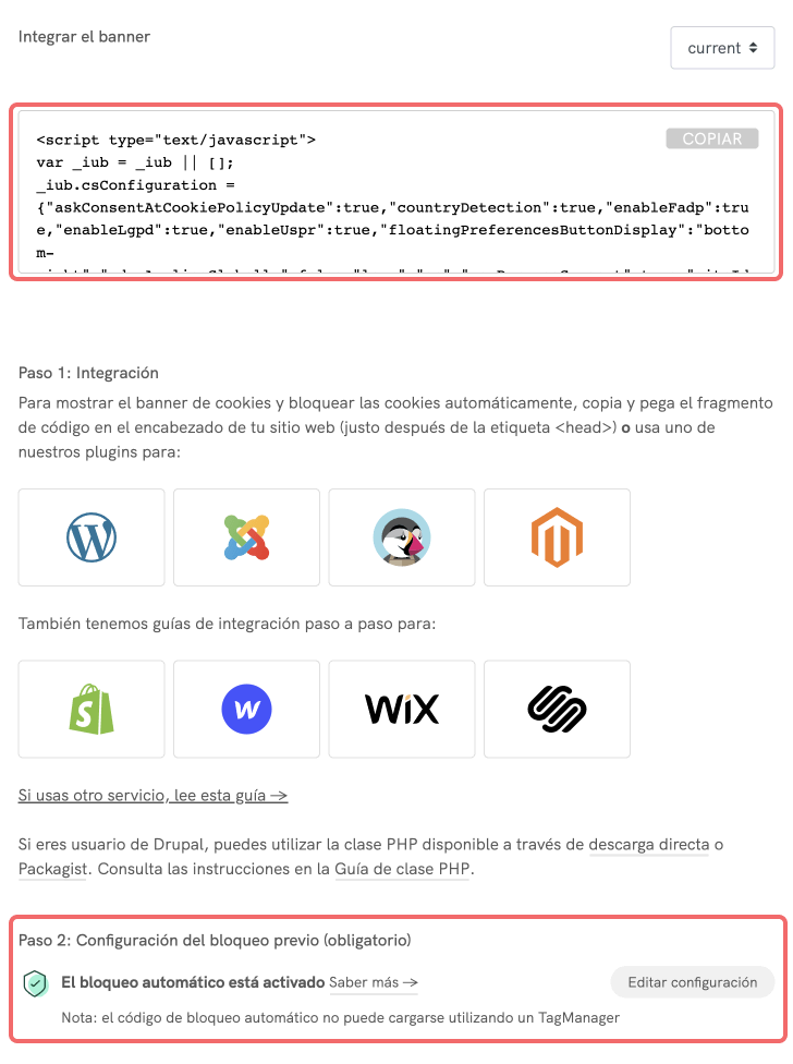 Para obtener una guía de instalación, consulta nuestra introducción a la Privacy Controls and Cookie Solution. Para WordPress, lee nuestra publicación sobre WordPress, en la que te enseñamos a utilizar el plugin para WordPress de la Privacy Controls and Cookie Solution de iubenda para automatizar el bloqueo de scripts.