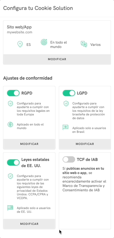Nuestras configuraciones automatizadas están preparadas para cumplir con los requisitos más estrictos de las principales legislaciones y regulaciones internacionales, pero puedes cambiar cada configuración haciendo clic en MODIFICAR en la parte inferior de cada recuadro.