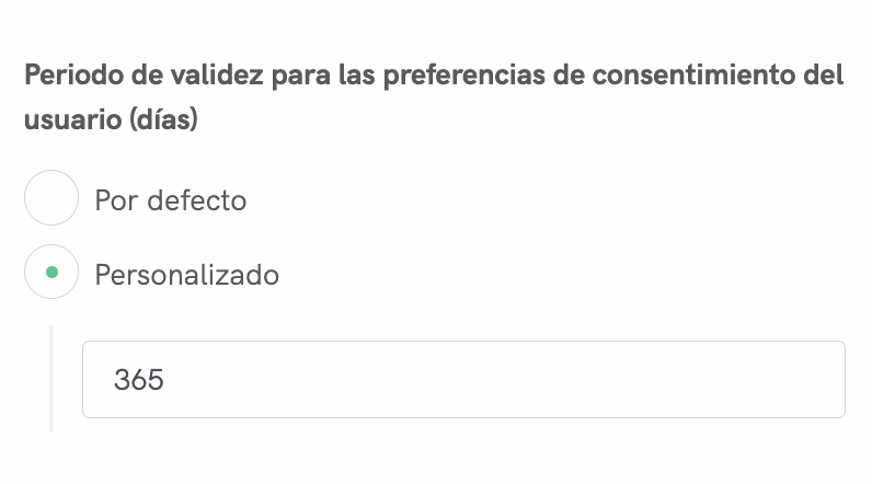 Recuerda que algunas APD de la UE han especificado lo que puede considerarse un período de tiempo razonable para la validez del consentimiento de las cookies (por ejemplo, según la APD francesa, 6 meses se considera un período de tiempo razonable). Privacy Controls and Cookie Solution te permite configurar fácilmente este período de tiempo. Para obtener más información sobre los plazos de validez del consentimiento de cookies, consulta la guía RGPD y consentimiento de cookies: tabla de resumen.