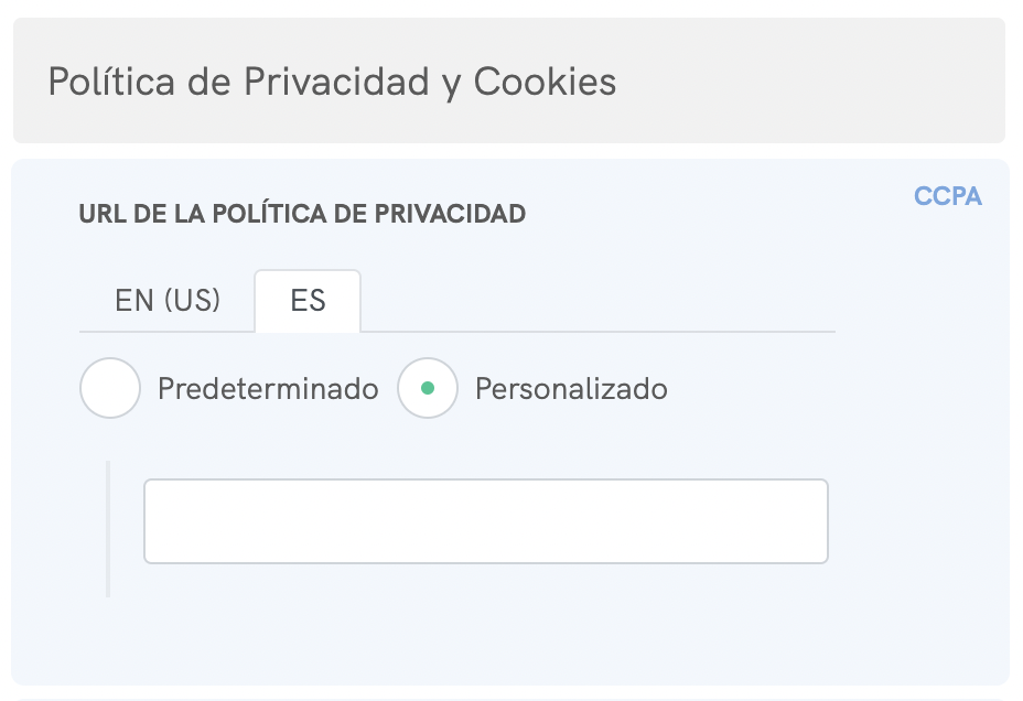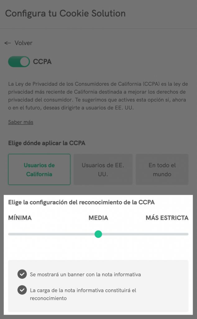 Si prefieres no mostrar un banner para notificar a tus usuarios sobre la CCPA, también puedes hacerlo utilizando uno de los siguientes ajustes: