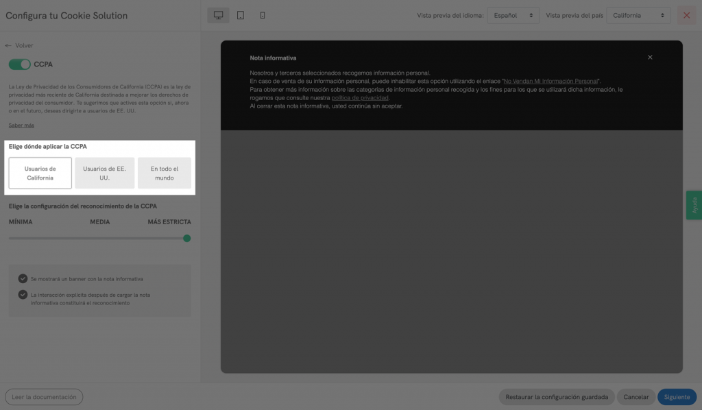 En este caso, mostraremos a los usuarios californianos un aviso que incorpore los requisitos del RGPD y de la CCPA, mientras que los usuarios que no estén en California tan solo recibirán los estándares del RGPD.