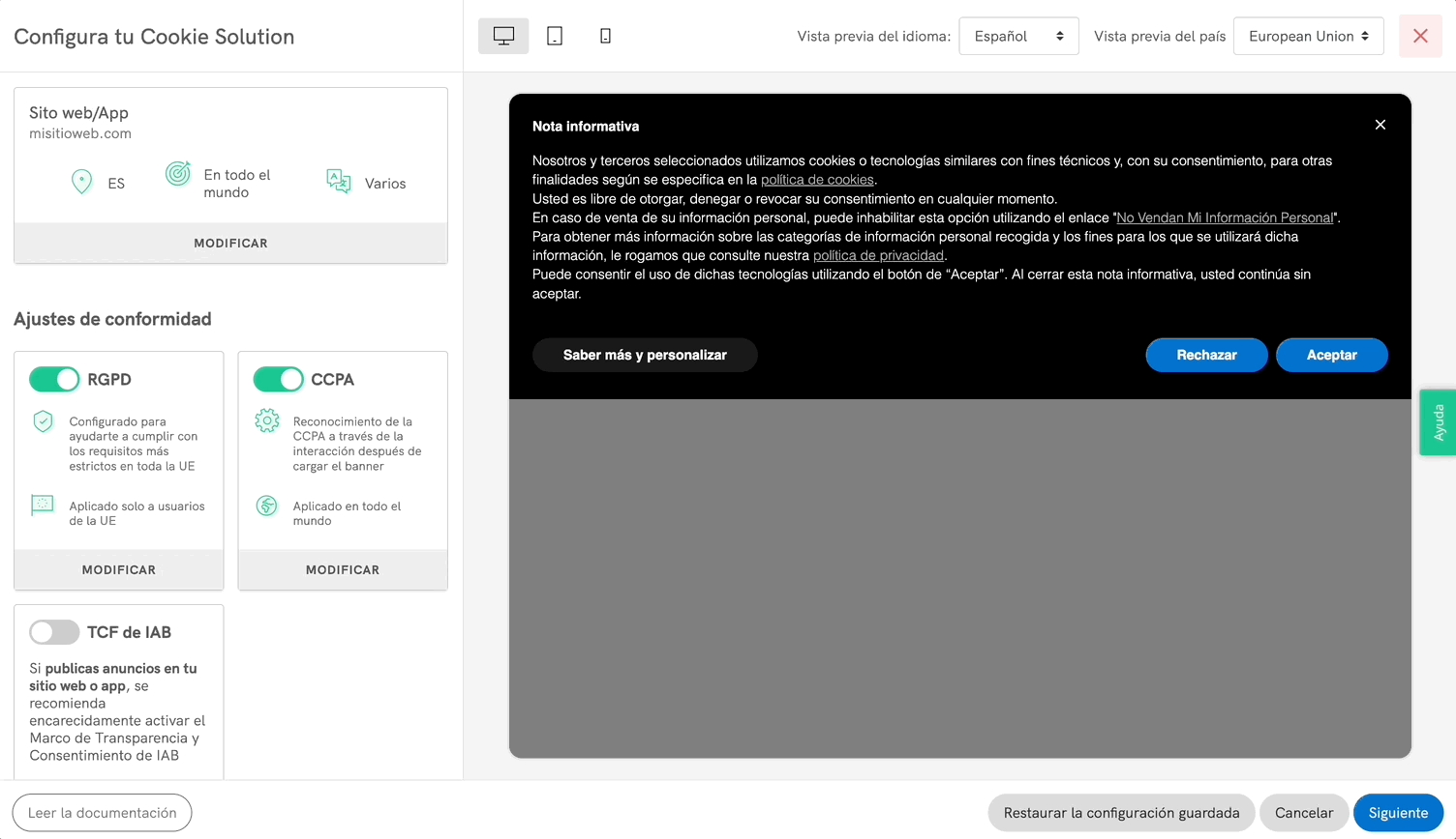 Si quieres habilitar el Marco de Cumplimiento de la CCPA de IAB (recomendado)