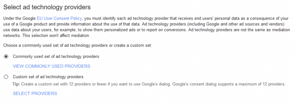 Dans le cas contraire, comme vous le verrez ci-dessous, Google affichera par défaut à vos utilisateurs se trouvant dans l’UE des annonces non personnalisées (ou ne leur affichera aucune annonce), ce qui aura un impact sur vos revenus publicitaires.