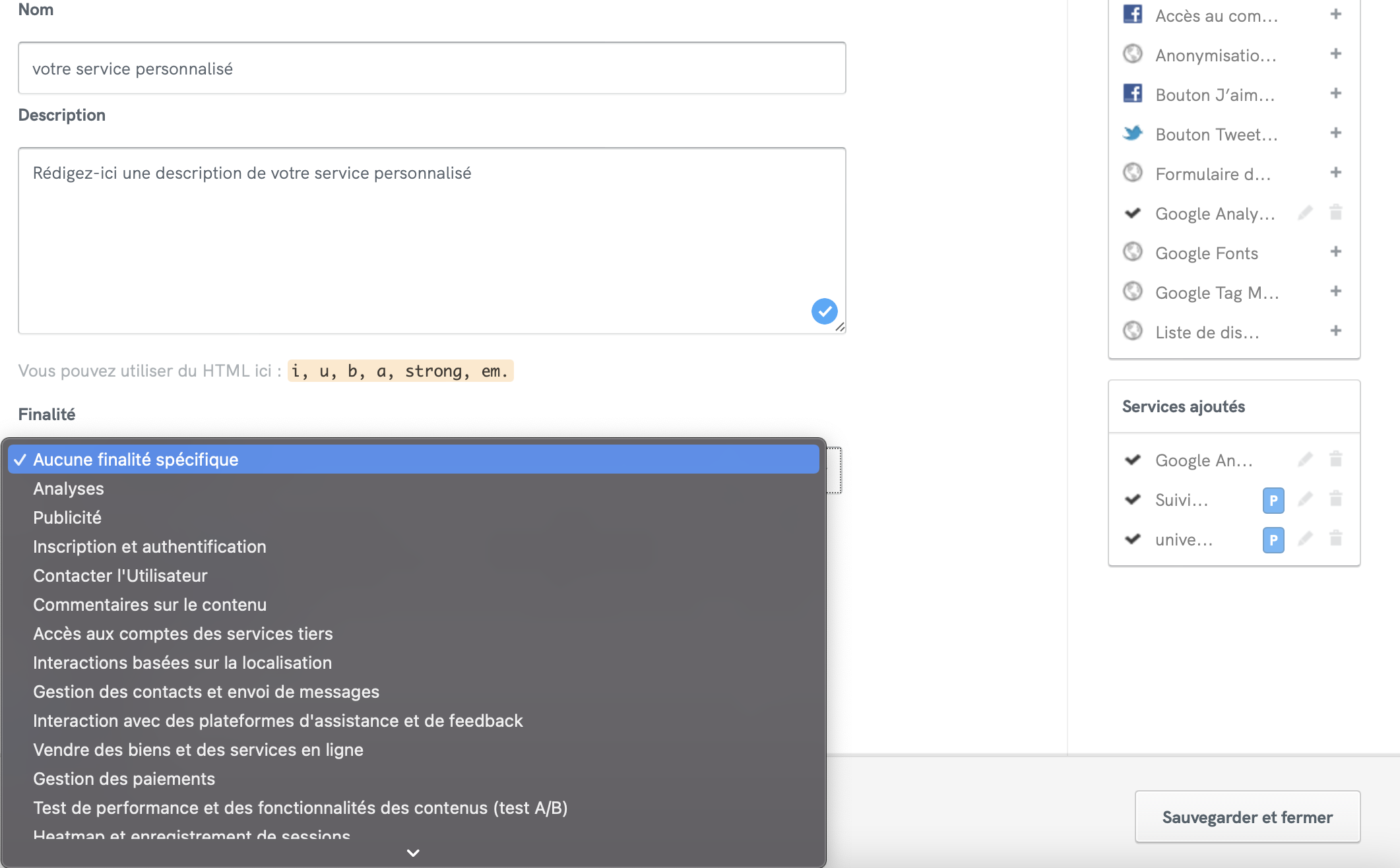 Ce champ vous permet d’assigner une finalité à votre service personnalisé en un simple clic. Il simplifie donc la catégorisation des différentes activités de collecte de données par le service, et vous permet d’être encore plus précis lors de la rédaction de vos clauses personnalisées. Enfin, ce champ inclut une liste de plus de 40 finalités prédéfinies parmi lesquelles choisir.