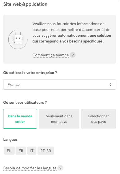 Pour commencer, il vous sera demandé de choisir où vous et vos utilisateurs êtes basés, afin de définir la portée de votre site web/application.