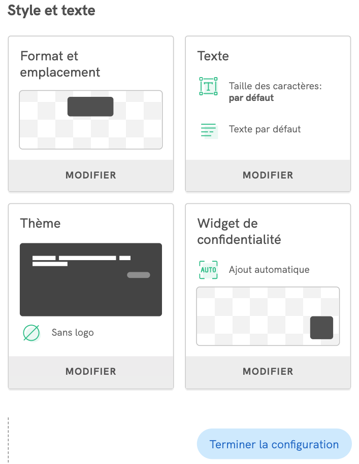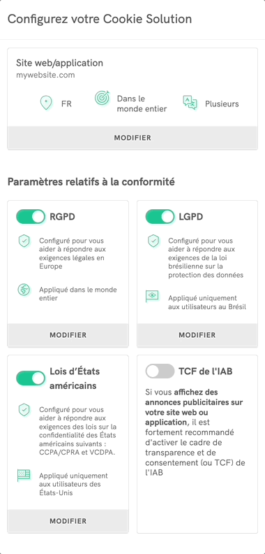Nos configurations automatisées sont mises en place de façon à se conformer aux exigences les plus strictes en matière de législations et réglementations. Vous pouvez cependant toujours modifier chaque réglage en cliquant sur MODIFIER dans le bloc correspondant.