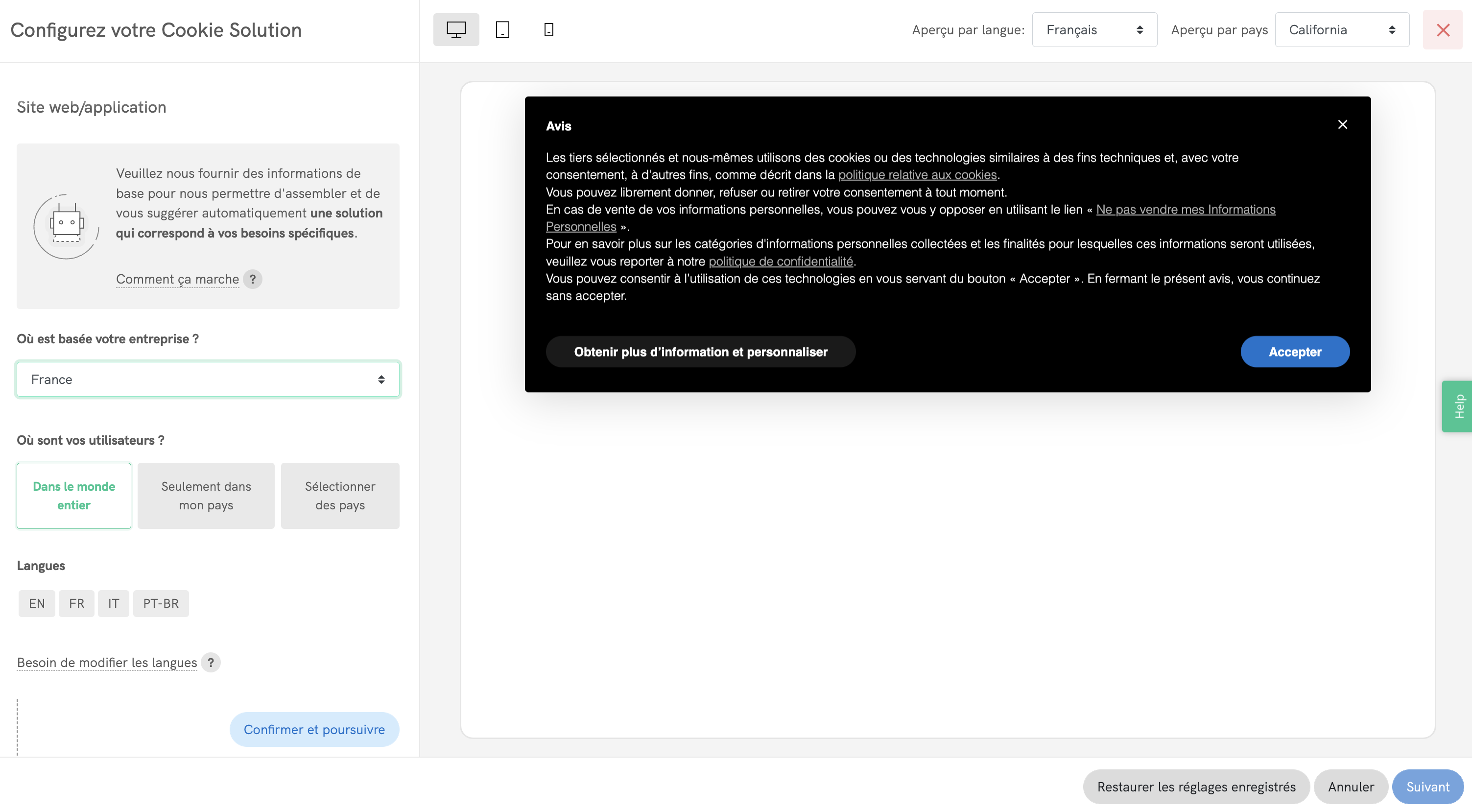 💡 Tout changement réalisé sera affiché instantanément dans l’aperçu (sur la partie droite de la page). Vous pouvez aussi passer à des aperçus différents (ordinateur, tablette, mobile), afficher le bandeau dans d’autres langues (si elles sont activées pour ce projet) ou visualiser la copie de l’avis correspondante par pays (dans le cas où un certain paramètre de conformité est appliqué seulement à un groupe d’utilisateurs en fonction du pays).