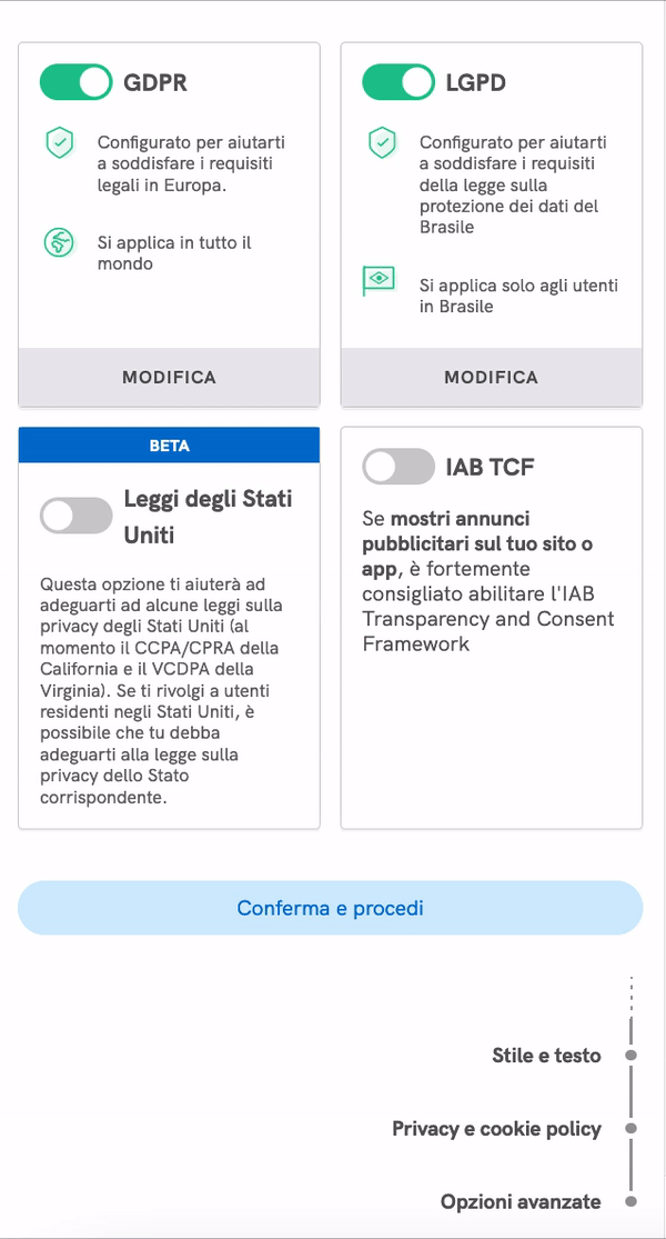 Una volta completato il passaggio precedente, Privacy Controls and Cookie Solution si configurerà automaticamente per soddisfare i nuovi requisiti degli Stati Uniti e permettere agli utenti di effettuare l’opt-out. Se non stai utilizzando una privacy policy generata con iubenda, ti basterà selezionare le regioni dove svolgi la tua attività durante la configurazione di Privacy Controls and Cookie Solution.