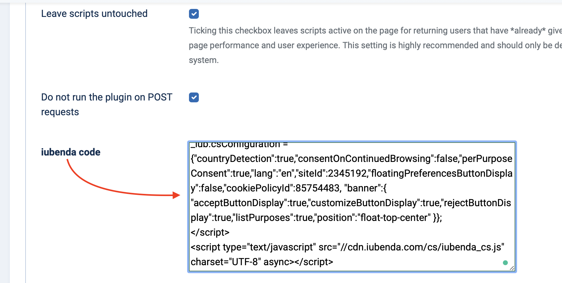 - Il plugin aggiunge automaticamente il codice di iubenda al tag