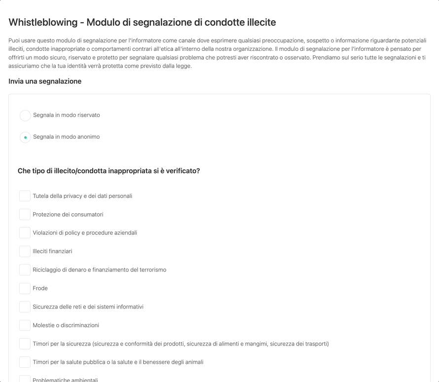 Per inviare una segnalazione per iscritto, un’organizzazione può creare una procedura interna – ad esempio, impostare un indirizzo email specifico a cui inviare i reclami – o affidarsi a una piattaforma di terze parti. Di solito, queste piattaforme consentono di snellire il processo di whistleblowing, garantendo al contempo anonimato e riservatezza.