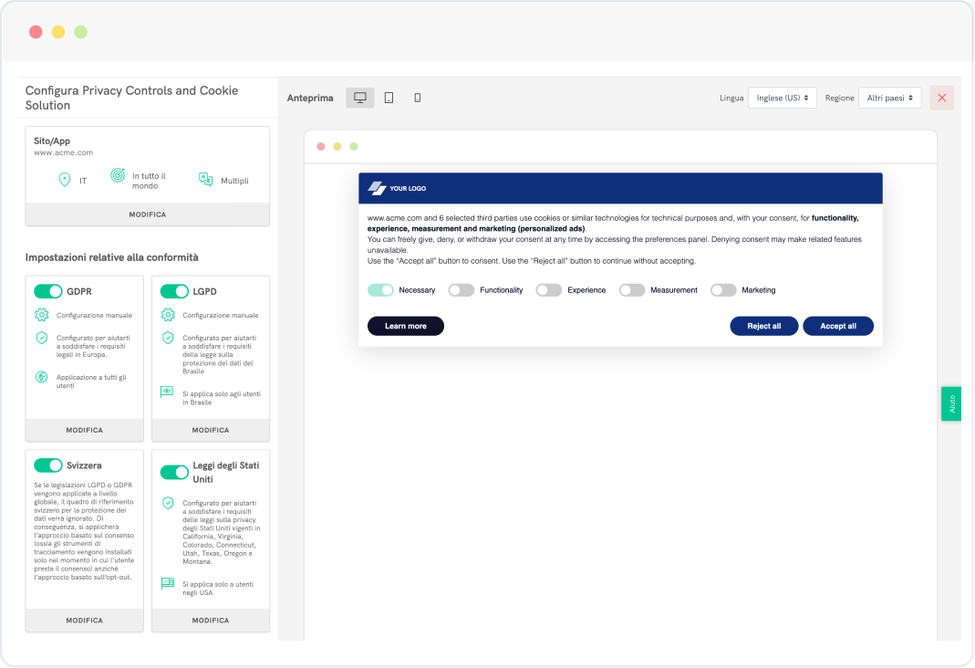 Ti aiutiamo con la compliance in più legislazioni, adattando la raccolta del consenso in base alla posizione dei tuoi utenti. Le nostre soluzioni sono allineate con i requisiti della privacy più rigorosi: GDPR dell’UE e del Regno Unito, ePrivacy dell’UE, leggi sulla privacy degli Stati Uniti come CCPA+CPRA, LPD della Svizzera e LGPD del Brasile.