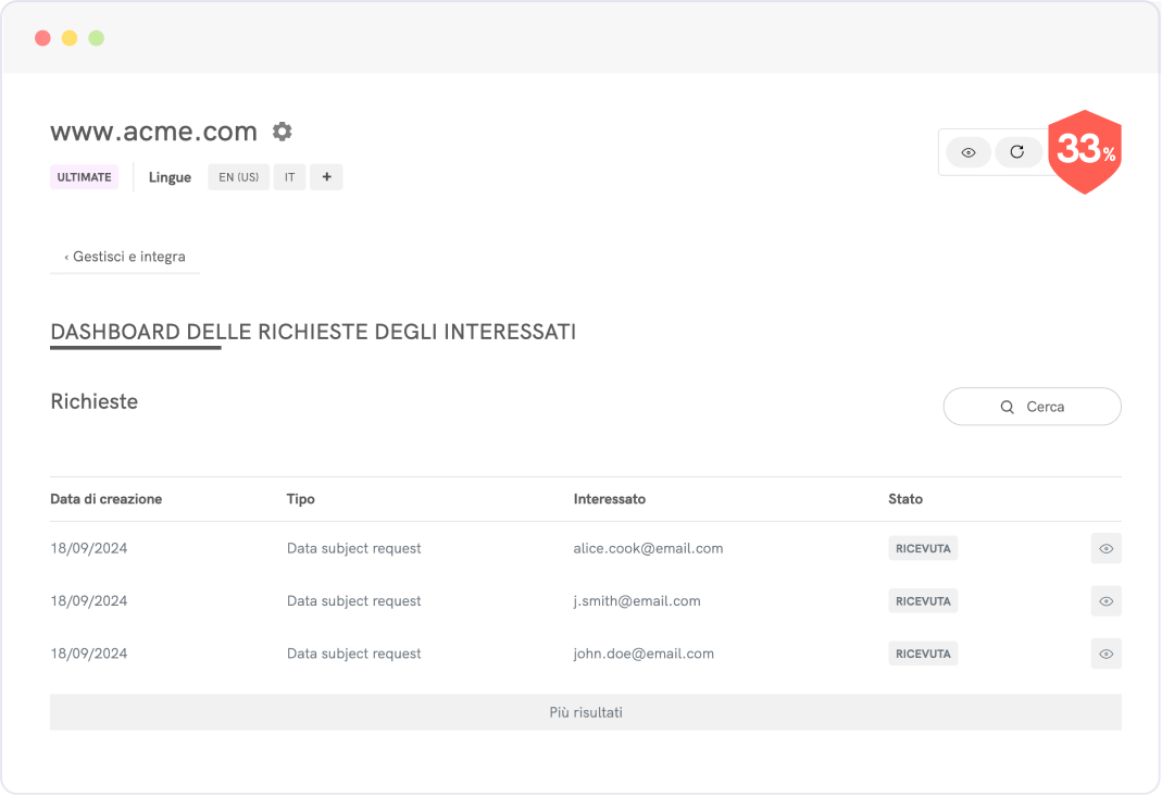 Le privacy policy devono essere aggiornate regolarmente, specialmente a seguito di modifiche nelle attività di trattamento dei dati, introduzione di nuove normative o aggiornamenti di leggi esistenti. Le nostre soluzioni ti mantengono automaticamente aggiornato, permettendoti di concentrarti su altre attività.