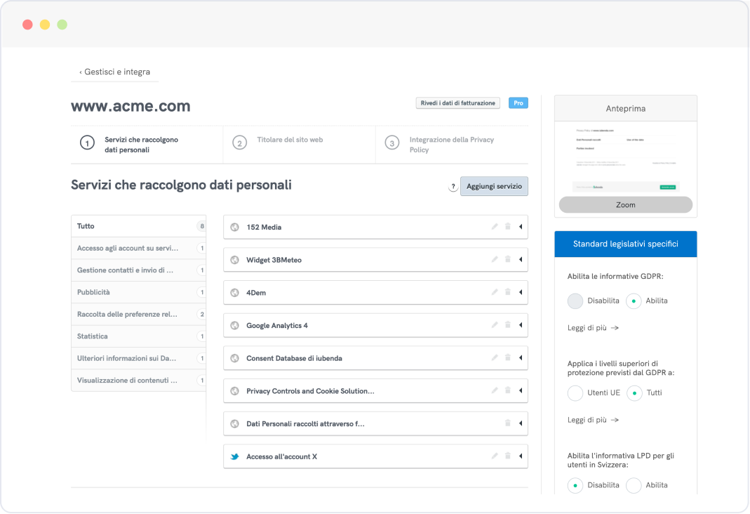 Sì, le soluzioni di iubenda sono progettate per allinearsi con le principali leggi sulla privacy a livello internazionale attraverso, ad esempio, il supporto multilingue e la raccolta dei consensi basata sulla posizione degli utenti.