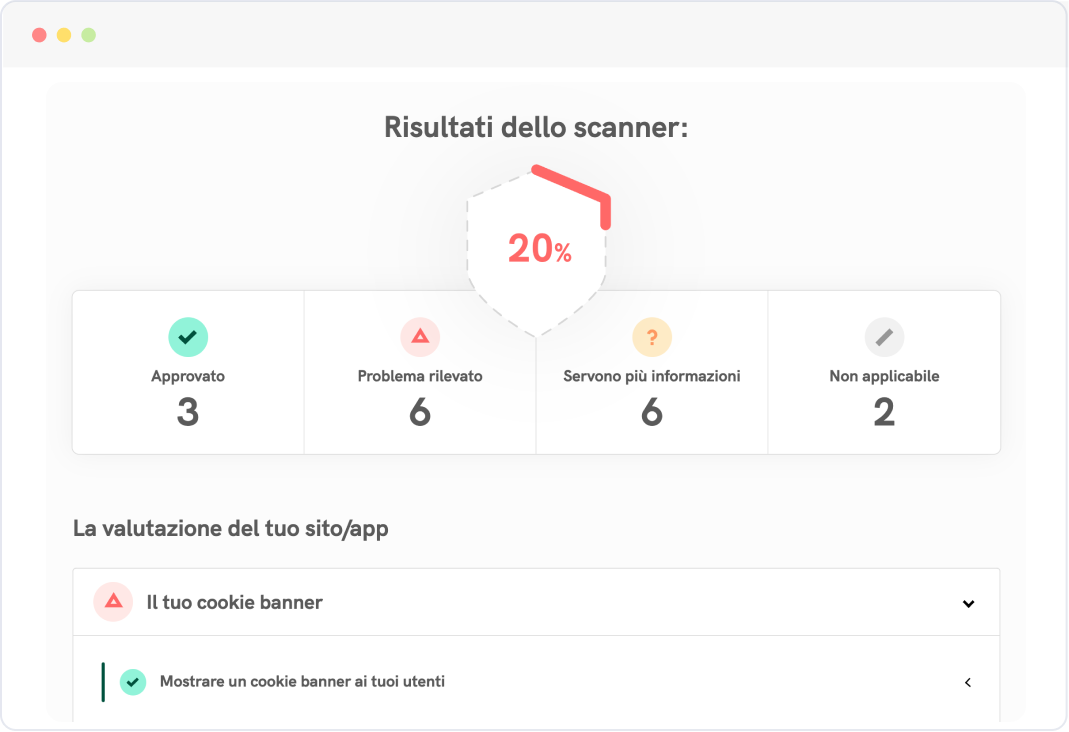 Scansiona il tuo sito per identificare i problemi di conformità in pochi secondi. Poi risolvili facilmente con la nostra configurazione automatica.