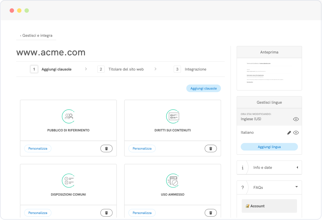 La soluzione per creare privacy e cookie policy, cookie banner, termini e condizioni, e per gestire le preferenze sulla privacy dei tuoi utenti.