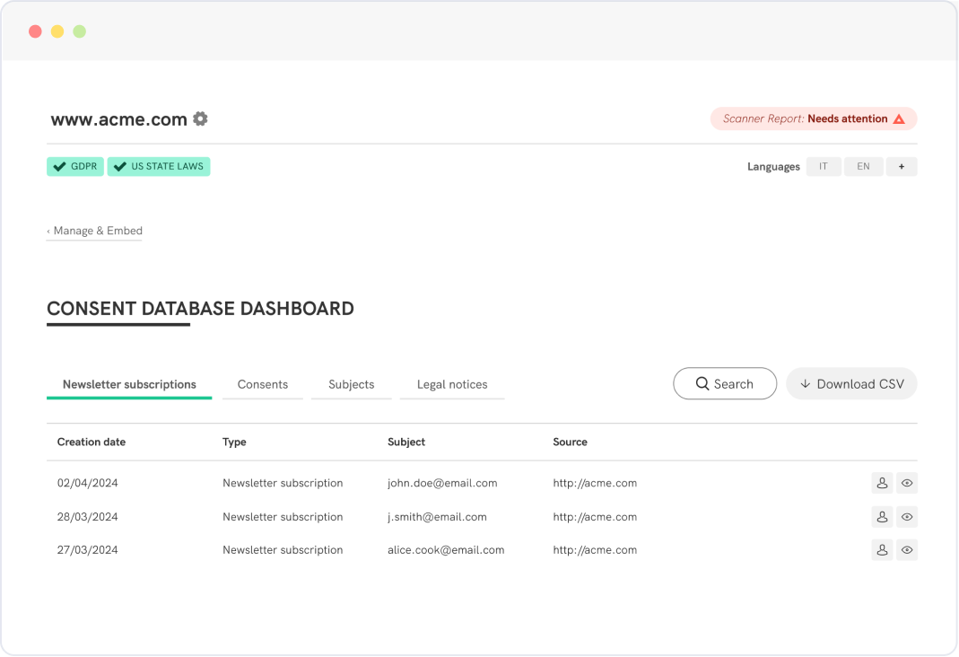 Scegli iubenda e gestisci tutto da un’unica dashboard intuitiva.