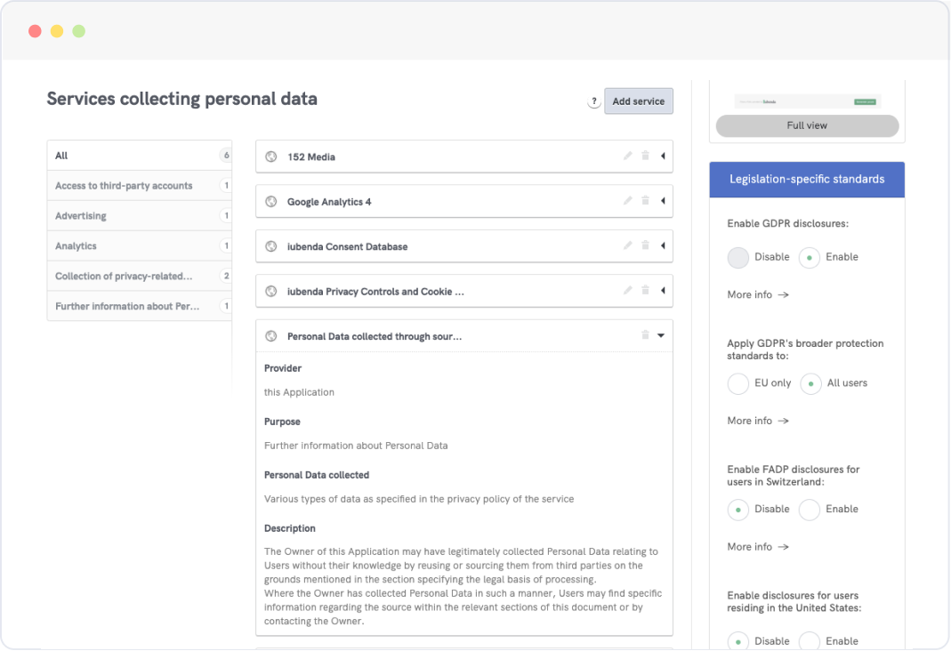 Perché dividersi tra più piattaforme quando basta una sola soluzione? iubenda ti aiuta a gestire tutte le tue esigenze di compliance da un’unica dashboard: privacy e cookie policy, cookie banner, termini e condizioni, registri di consenso, richieste di accesso ai dati e molto altro ancora!