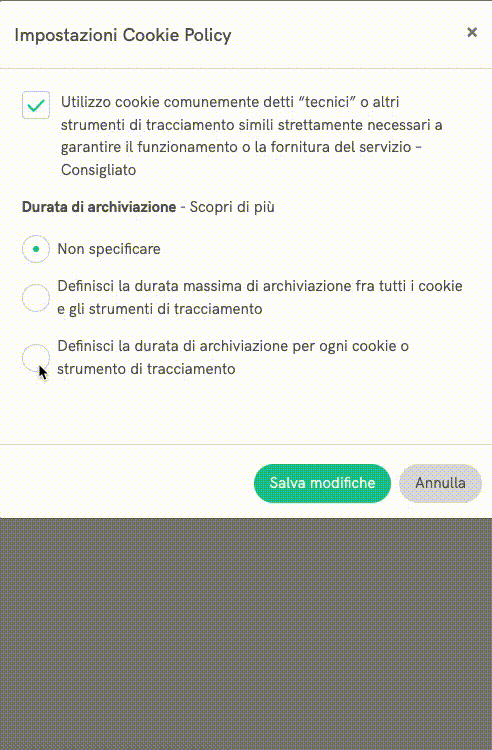 Dovrai poi indicare se i cookie o altri tracciatori da te utilizzati sono strettamente necessari a garantire il funzionamento del servizio (questo include i cookie comunemente detti “tecnici”). Puoi farlo spuntando la relativa checkbox sotto “Impostazioni Cookie Policy”.