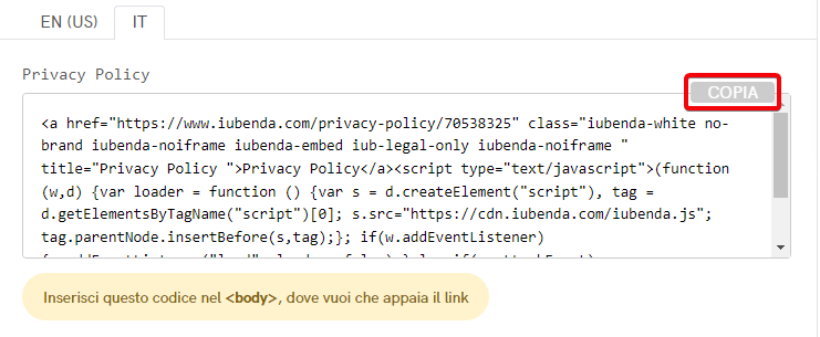 Nell’area d’integrazione della tua dashboard iubenda, fai click su Integra il testo nel body e poi su COPIA alla voce Termini e Condizioni
