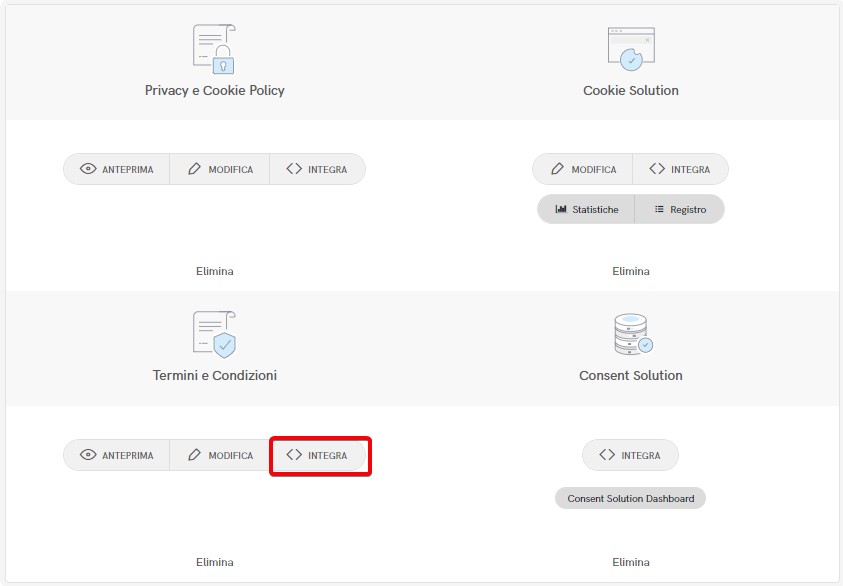Per iniziare, dirigiti nella tua dashboard iubenda e clicca su [Il tuo sito] >Termini e Condizioni> Integra