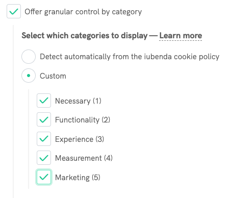 D’ora in poi, quando i tuoi utenti cliccheranno sul pulsante Scopri di più e personalizza nel tuo cookie banner per gestire le proprie preferenze, vedranno le seguenti opzioni: