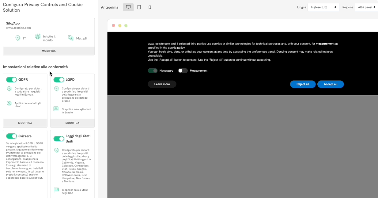 💡 In qualità di CMP certificata, abbiamo integrato il lo standard europeo di settore TCF di IAB e il Compliance Framework delle leggi degli Stati Uniti nella nostra Privacy Controls and Cookie Solution per aiutare i publisher a rispettare sia i requisiti di legge che gli standard di settore, massimizzando al contempo gli introiti pubblicitari.