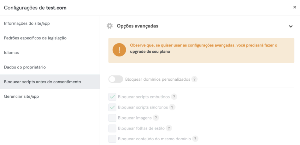 - Bloquear scripts síncronos: Quando esta opção estiver habilitada, os scripts síncronos serão bloqueados em seu site antes do consentimento.