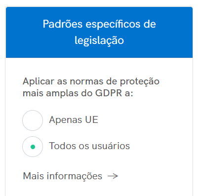• Sob o título “Aplicar as normas de proteção mais amplas do GDPR a:”, escolha entre: Aplicar a todos os usuários (opção padrão) ou Aplicar somente a usuários da UE.