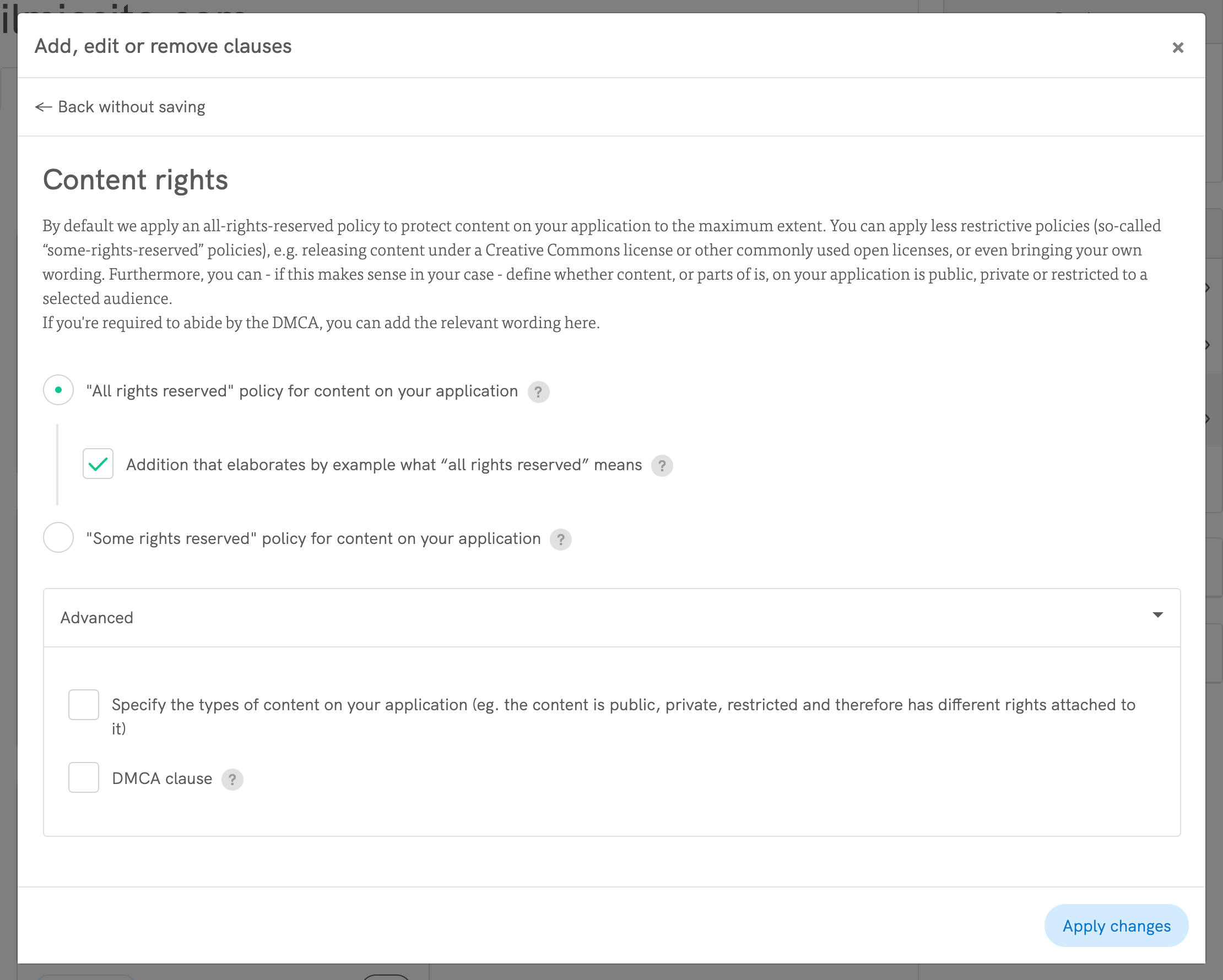 - personalizável entre mais de 100 cláusulas (incluindo “Direitos de conteúdo”, para proteger seu conteúdo);