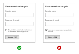 O consentimento deve ser “dado livremente”: não é permitido obrigar os usuários a se inscreverem em sua lista de e-mails ou fazer parecer que o registro é obrigatório. Por esse motivo, é necessário esclarecer que o registro é opcional. Isso é especialmente importante nos casos em que e-books e white papers se tornam disponíveis para download gratuito. Mesmo que o endereço de e-mail do usuário seja necessário para a prestação do serviço, a assinatura da newsletter não é. Nesse caso, você não deve dar a impressão de que a inscrição no newsletter é obrigatória e deve deixar claro que é opcional.