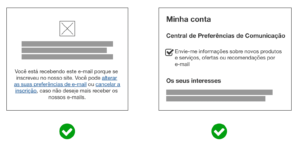 A opção “cancelar” deve ser facilmente visível e deve incluir uma explicação clara de como o usuário pode optar por não receber e-mails no futuro. O aviso deve ser claramente reconhecível, legível e compreensível para o usuário comum. Uma forma prática de implementar essa opção é inserir um link para “cancelar” com uma declaração informando o usuário sobre a opção.