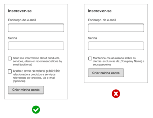 Portanto, é necessário que o processo de obtenção do consentimento do usuário seja simples e envolva uma ação de “adesão” clara. Isso significa que mecanismos como caixas de seleção pré-selecionadas de assinatura do newsletter não são permitidos, uma vez que o regulamento europeu proíbe expressamente caixas pré-selecionadas e outros métodos alternativos de “opt-out”.